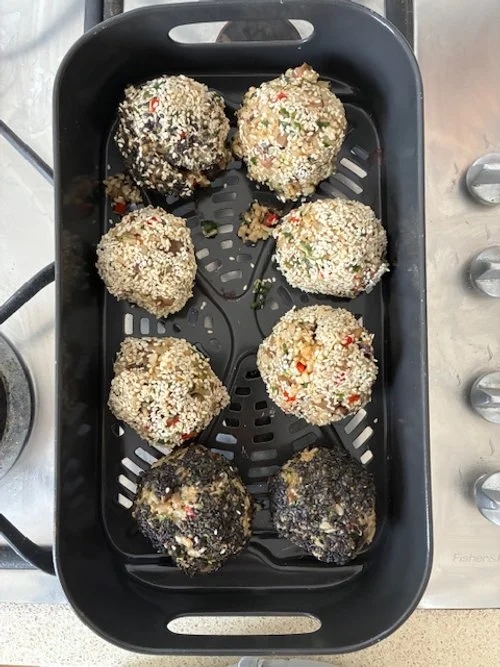 Once the rice has cooled enough to handle, with clean hand spoon a large amount of rice and form in to a ball with your hands. Roll in the sesame seeds and place carefully on your air fryer tray. Repeat until you have finished all your rice. Preheat your air fryer to 200 c. Air fry for 12-15 minutes checking at 10-12 minutes to make sure the sesame seeds are turning golden and not burning. Once finished, leave the balls for several minutes to firm up.