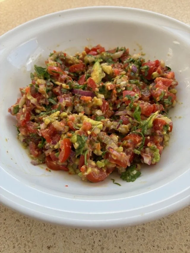 Prepare the guacamole. Mash the avocado flesh. Add the fresh lime juice. Finely chop the onion, garlic, chilli and cilantro. Add to the mashed avocado. Chop the tomatoes and add. Mix and add some ground pepper. Set aside.