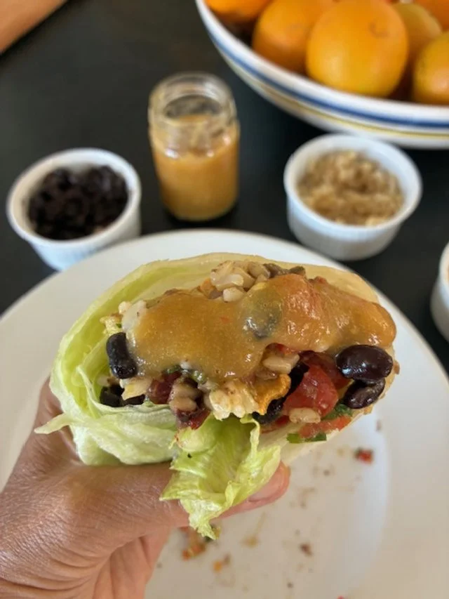 The outer leaves of a very fresh head of iceberg works best but you can hobble together inner pieces the way I did today. And if you don’t want to wrap it all up, chop up the lettuce and make a burrito bowl instead!