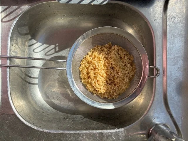 Empty the rice into a strainer and let it sit for 15 minutes (in summer) and 30 minutes (in winter).