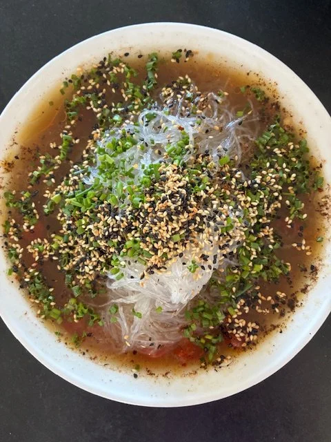 I decided to make it a noodle soup rather than dip the noodles in to a dipping sauce. And rather than buckwheat noodles, I use potato thread mung bean noodles. or organic sweet potato noodles.