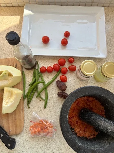 Peel and slice the garlic, trim the chilli stalks, slice and add to a large mort and pestle, On a wooden cutting board, cut the dried shrimp into small pieces. Add them to the mort and pestle. Pound the ingredients until the shrimp, garlic and chilli are completely broken down and make a paste. Add in the dates and continue to pound until they are fully incorporated. Add in the lime juice, No fish sauce and salt if needed. Set aside.