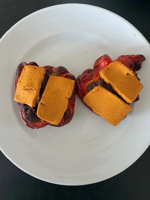 Take the red pepper halves and place a scoop of cashew nut cream along the bottom of each half. Stuff each pepper half full with the chilli. Place on a non stick ceramic baking sheet and bake for about 20-25 minutes or until the red pepper can be pierced easily with a fork. A few minutes before the peppers finish cooking, add slices of cashew nut ‘cheddar cheese’ on top.