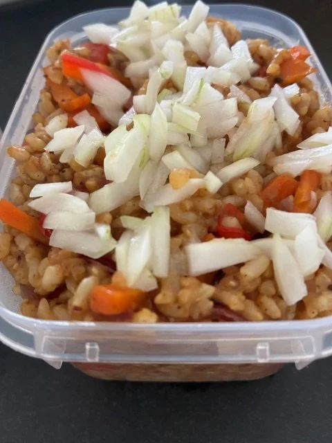 If I am out all day, I pack a generous lunch so I have plenty of food for meals and snacks. I try to bring things that pack well and are delicious at room temperature. Last night, I took out a container of frozen brown rice. This morning, before I left, I adapted and prepared Zaynab Issa’s recipe for Cumin Chicken Fried Rice from NYT cooking. I replaced the chicken with carrots and red pepper.