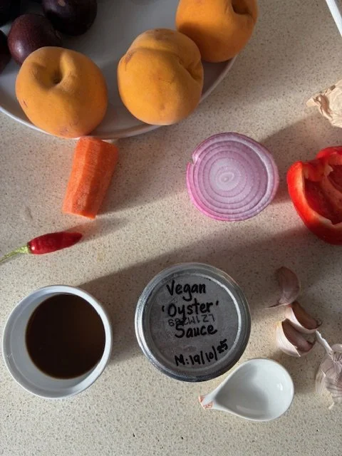 Put the pan back on a medium heat and add the salt. Stirring constantly, add the No fish sauce and Chinese five spice. Make the tapioca slurry and add it in to the oyster sauce. Cook for several minutes stirring it until it thickens slightly.