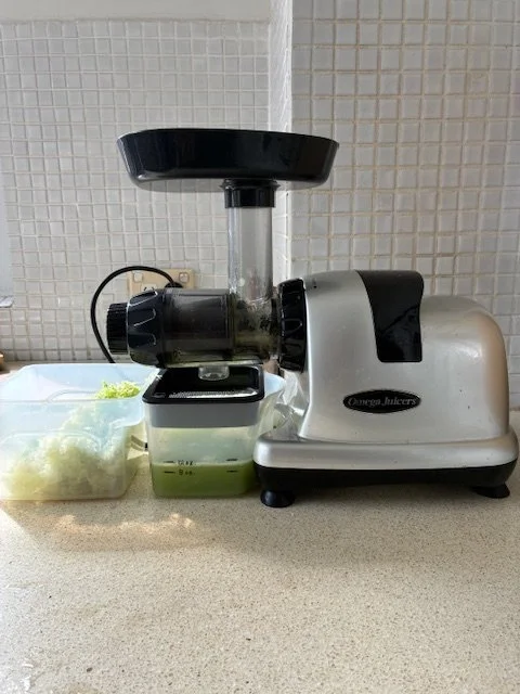 Run through the juicer. Strain if your juicer does not have one. Drink and enjoy right away on an empty stomach or 15-30 minutes after a lemon or lime water.