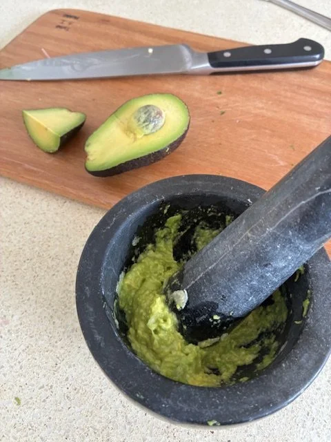 Make avocado toast by pounding a clove of garlic in a mort and pestle with a pinch of salt. When you have a paste, add in 1/4-1/2 avocado flesh and pound until fully combined. Toast two slices of bread and slather with avocado and enjoy with a cup of tea!