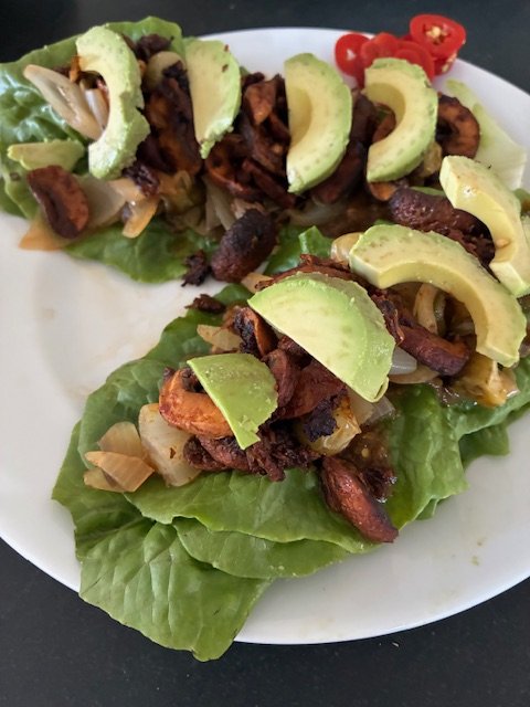 The first time I made these frajitas, I made them on potato tortillas and put more toppings on. This time I simplified the additions, using on salsa on the bottom layer and avocado slices on the top. I stored the leftover mushrooms and onions/peppers from a few days ago in the refrigerator for a couple of days and like most foods with rich spices, the flavours deepened and matured beautfully when heated up. The crunch and freshness of the lettuce leaves is the perfect base for the deeply spiced toppings.