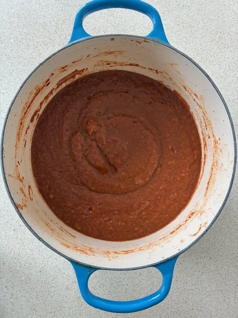 Add the garlic, chillies, salt, pepper and the roasted and blended tomatoes to the pot. Stir and bring to a boil covered. Reduce the heat to a gentle simmer for about an hour to an hour and a half until you have a thickened sauce. Taste and adjust flavour if necessary. At this stage, the sauce should be sweet and flavourful.