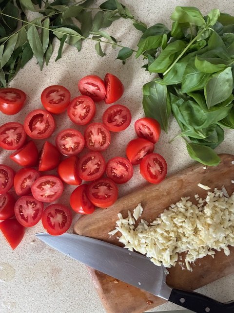 This sauce came about quite by chance … a combination of using up what I had left over and adding tomatoes, perfect for making sauce, along with a bunch of fresh basil from the farmer’s market.