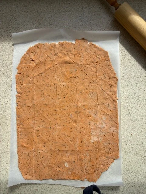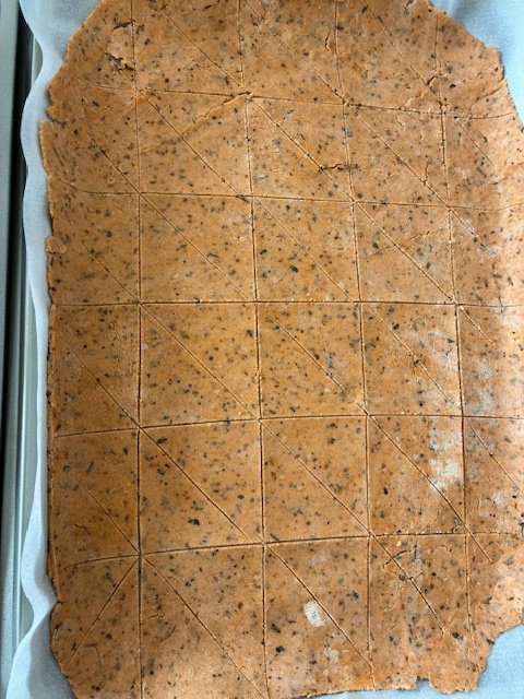 Combine the wet and dry ingredients and mix to form a dough. Cut the dough in to two equal balls. On a sheet of baking paper, the size of your baking sheet, roll out one ball as thin as possible to cover the entire baking sheet. Roll out the second ball of dough the same way. Score the dough into squares and then triangles.