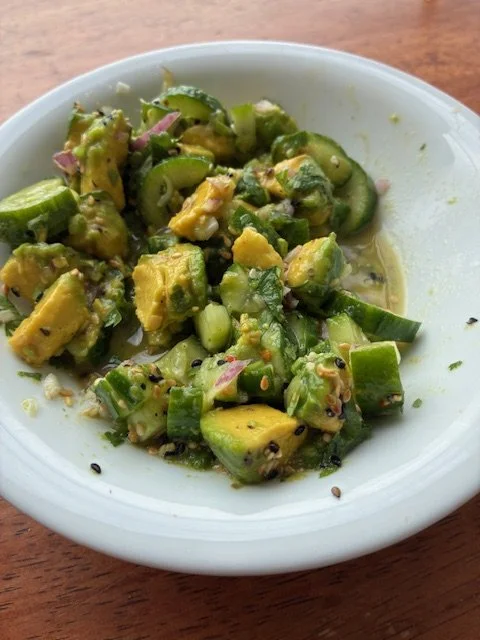 Smashed cucumber salad came from China. The crushed cucumbers create more surfaces to absorb dressing. It can be served as a side or a refreshing summer salad. For some added complexity, I added avocado and toasted sesame seeds. While it originally was served with an oil and soy dressing, I like to eat it with a lime/lemon and No Fish sauce based dressing. It will be great with whatever kind of dressing you love.