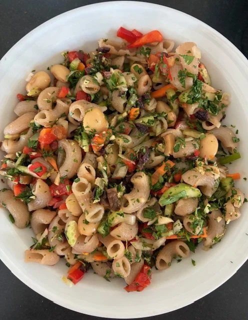 It doesn’t matter what you add to your pasta and beans of choice. Include whatever vegetables you have that need to be used. Those vegetables tastier when cooked can be briefly steamed or blanched. Serve with your favourite dressing and enjoy!