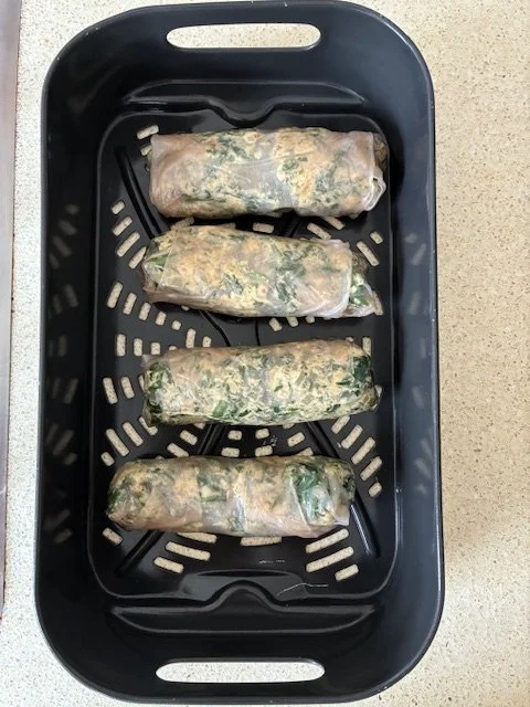Fill a low, wide bowl with warm water. Clear and clean a counter space to roll the spanakopita. Place one brown rice paper in the warm water for a few seconds and let the excess water drip off. Place on the counter. On the lower half, spoon a line of spinach leaving space on all sides. Lay a slice of feta on top of the spinach and spoon another layer of spinach on top. Roll the rice paper the same way you would a Vietnamese roll. Gently fold the bottom over the spinach, fold in both sides and roll shut. Place in an air fryer tray or on a baking sheet lined with baking paper (if you are cooking in an oven). Repeat until you have finished the spinach filling.