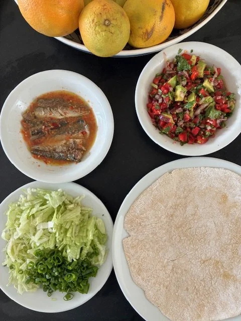 When you are ready to serve, place the bowls of marinated fish, pico de gallo and lettuce/green onions on the table. Serve each person a plate with a warm potato tortilla. Pile the desired ingredients on your tortilla, wrap and enjoy!